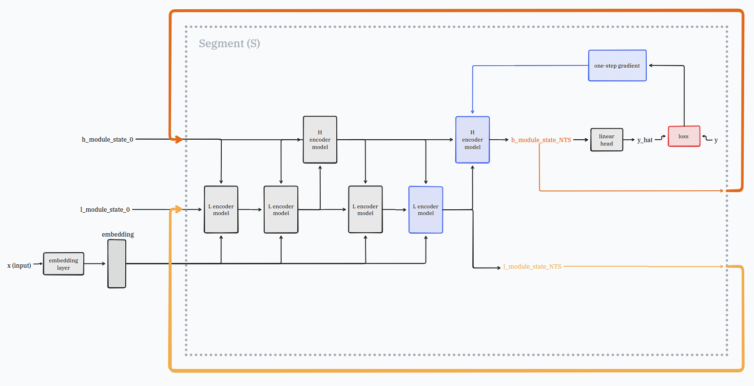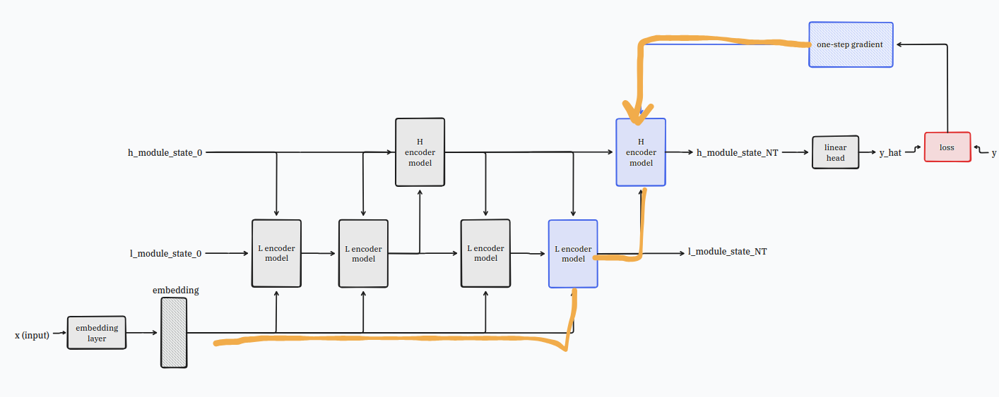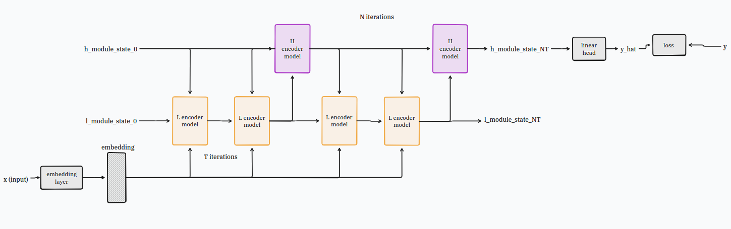 the l module will be the one that will talk a lot, it will be recurring with itself T times before giving it’s work to the h module which will review it. the h module will then give gentle guidance to the l modules and it will do this N times.