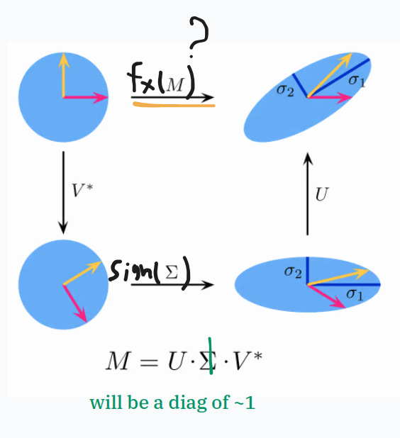 muon’s contributor says that if we run svd on momentum update matrix and throw away the singular value then we get roughly unit vector length in all directions